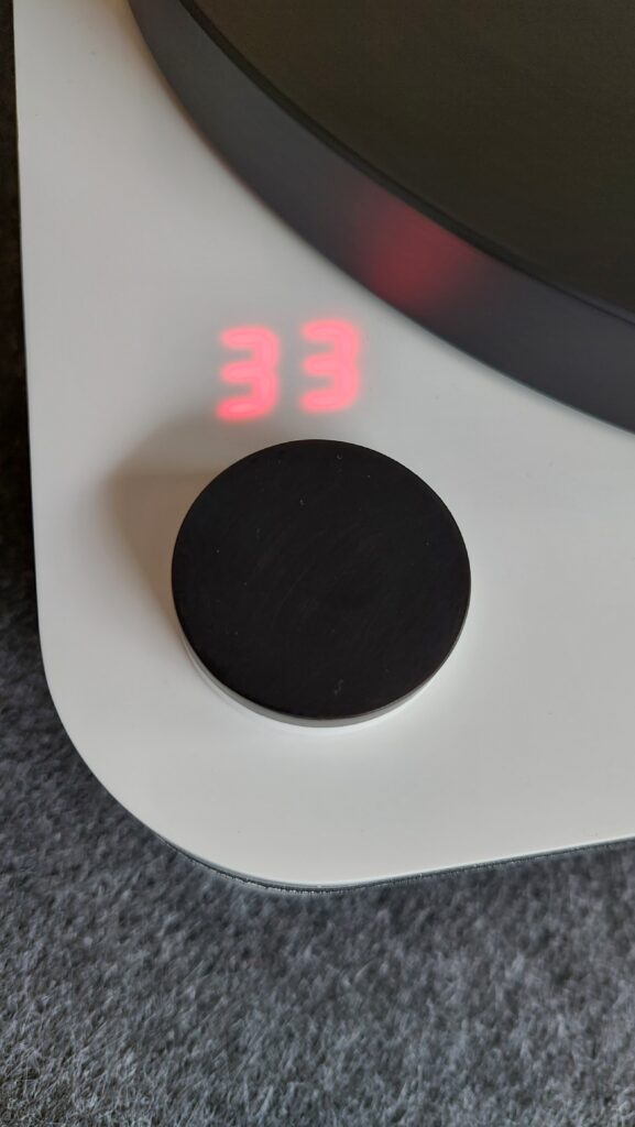 The R3 also retains the coolest control mechanism I’ve seen for a long time. A double-sided magnetic puck the size of a checkers piece, one side white, the other black, is placed over a backlit patch on the top plate. Black face uppermost gives 33.3 rpm; white face gives 45 rpm; the speed is displayed in numeric form just below the surface of the translucent Corian top plate once the platter rotation has stabilised. Take the puck off and put it to one side, and the motor stops. The pucks are £20 each, and it may be worth ordering a spare, because for sure, one is going to end up down the back of the sofa, or in the dog, or something…